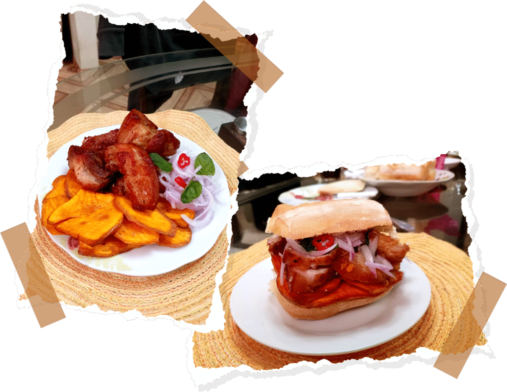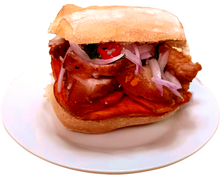 Ingredientes: Pan tradicional relleno con trozos de cerdo, jugoso y bien sazonado, acompañado de sarsa criolla y camote frito. Una delicia intensa y popular en la mesa criolla.