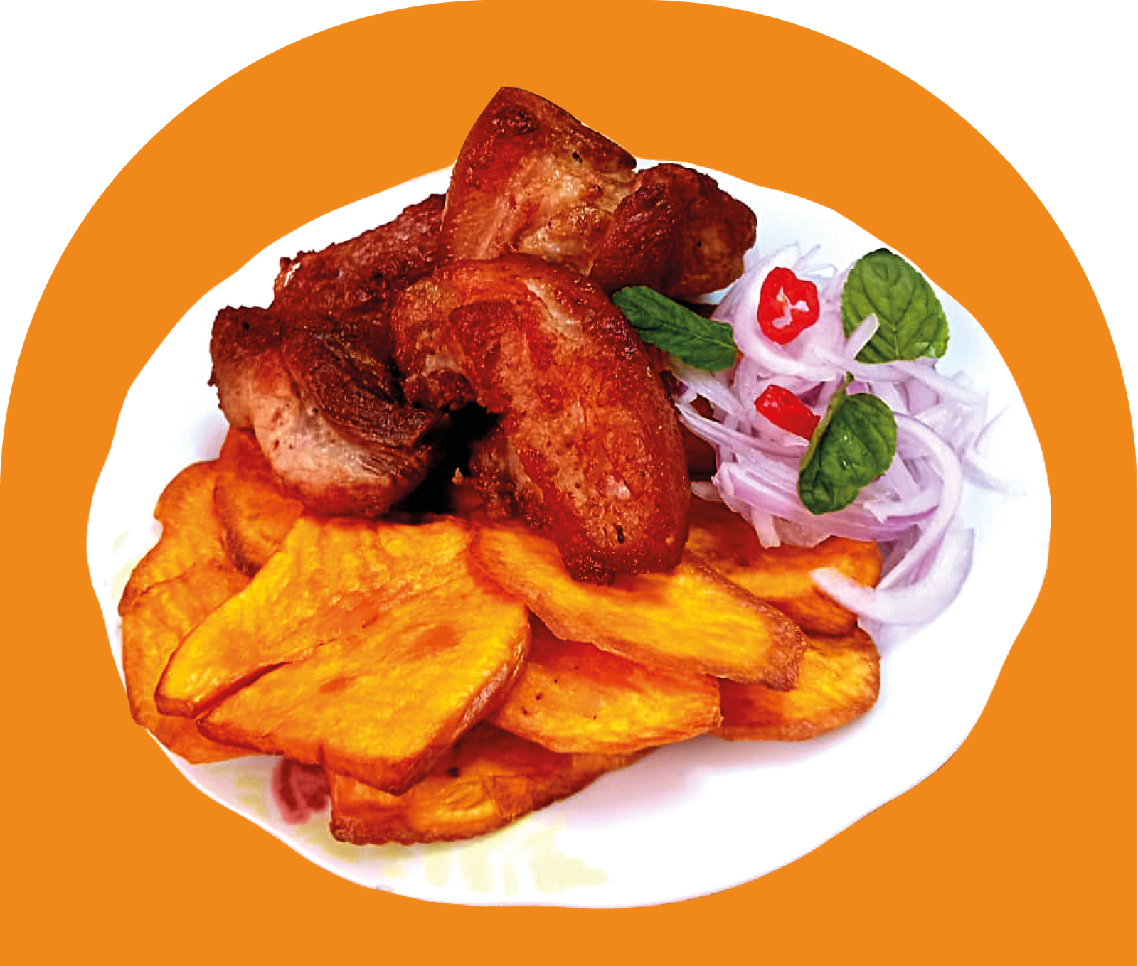 Ingredientes: Chancho crocante, jugoso y suavecito, acompañado de papas, choclo y sarsa criolla.